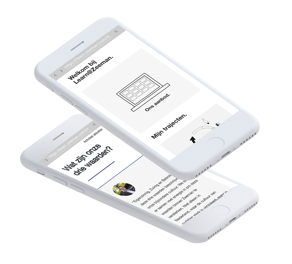 Zeeman koos voor een ‘mobile first’ strategie. De primaire focus lag in eerste instantie bij het onboarden van nieuwe medewerkers in de winkels. De retailer startte met een innovatief nieuw pre-boarding en onboarding-programma, waarbij de eerste kennismaking ook via Augmented Reality plaatsvond. Inmiddels is het onboarding aanbod uitgebreid met een op de doelgroep gericht Onboarding-programma voor nieuwe collega’s op het Servicekantoor, in het Distributiecentrum en bij Transport.